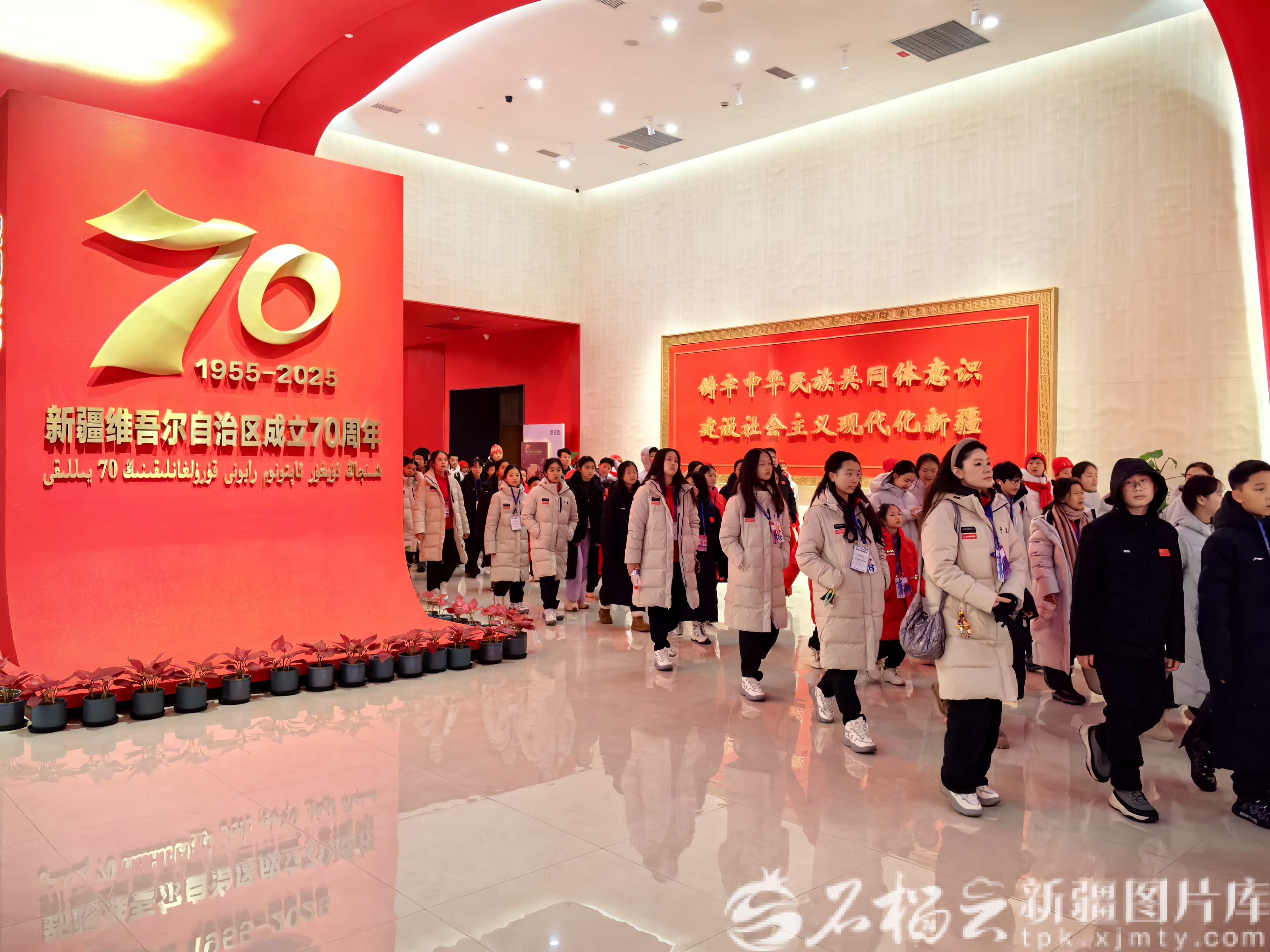 当天,参加2026年“奔跑吧·少年”全国青少年冬季阳光体育大会的400余名青少年,参观了新疆维吾尔自治区成立70周年主题成就展。1600余幅跨越时空的珍贵图片、1400余件实物与精致模型,搭配沉浸式多媒体视频和场景还原,生动呈现了新疆70年来的沧桑巨变,让这些来自全国各地的青少年们真切感受到边疆发展的脉动。