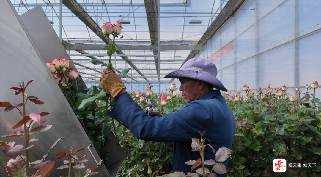2月1日,云南昆明花卉种植基地里工人正在采摘新鲜月季。云南日报-云新闻记者 邵琳鉴/摄