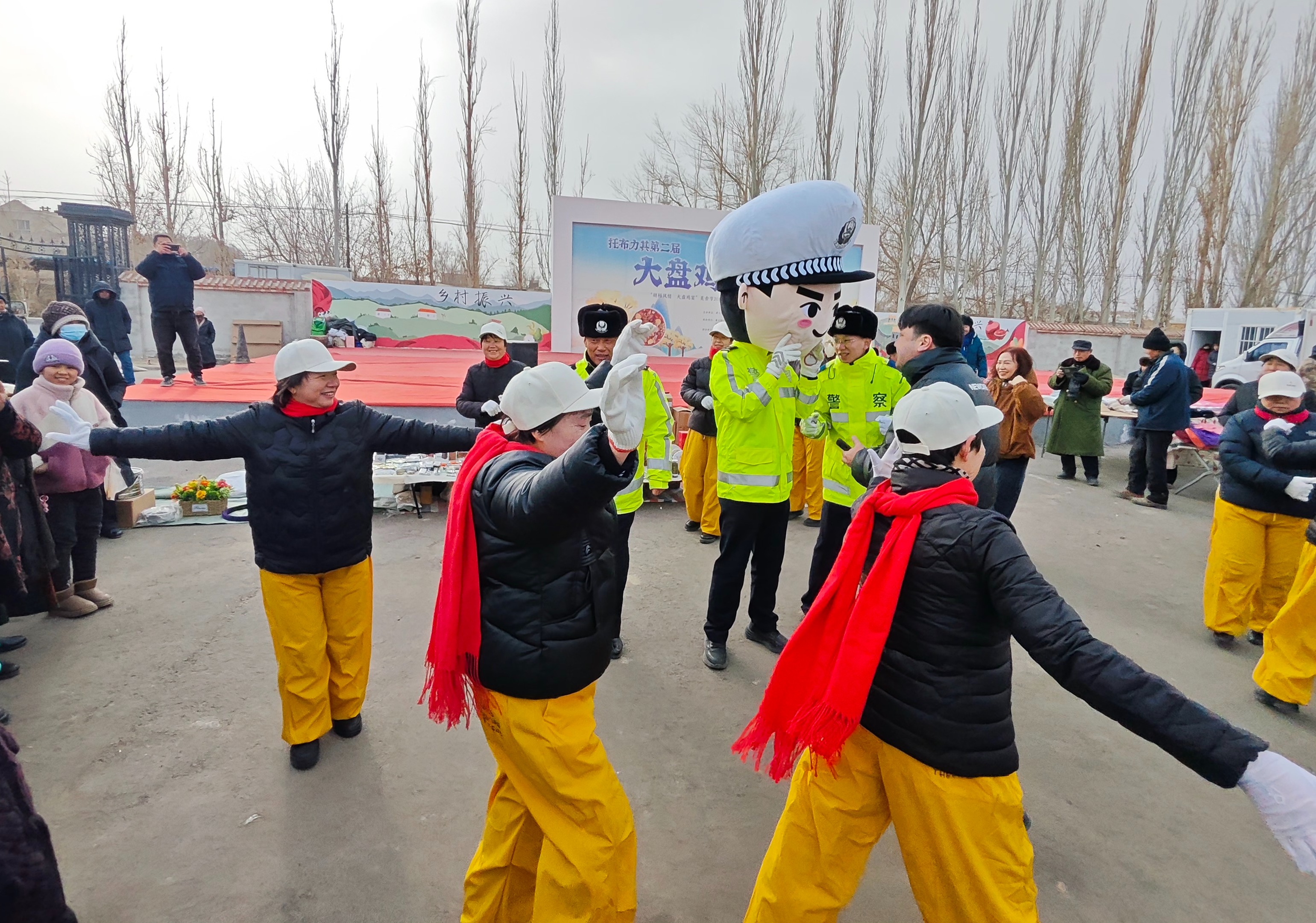 巴扎中央,游客、村民、商贩……几十个人围成一圈,圈内就是舞台,队员们拉开架势,表演交通安全手势操、交通安全情景剧,展现农用车非法载人、酒驾醉驾、违规变道等交通违法行为的危害。
