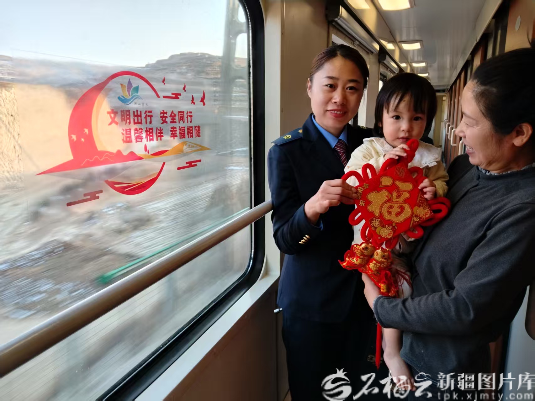 列车乘务人员为旅客送“福”。姚雪摄