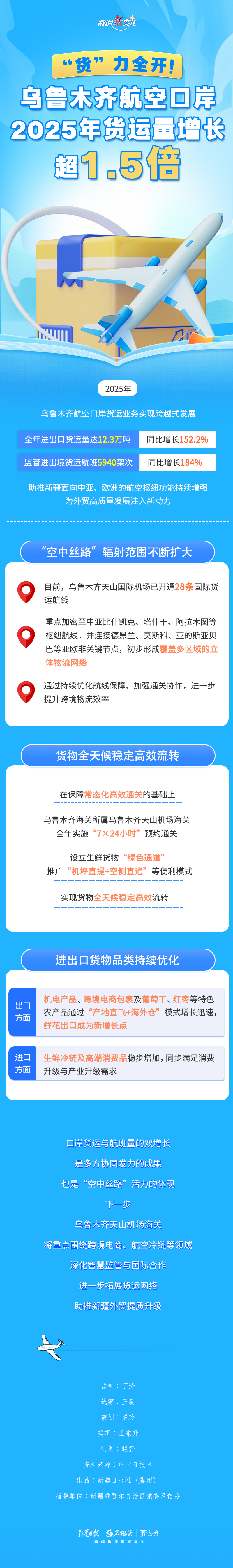 2025年,乌鲁木齐航空口岸货运业务实现跨越式发展。据统计,全年进出口货运量达12.3万吨,同比增长152.2%;监管进出境货运航班5940架次,同比增长184%。优异成绩的背后,离不开各方的协同努力与创新实践。本期《数说“新”变化》带您探寻数据背后都有哪些关键举措。