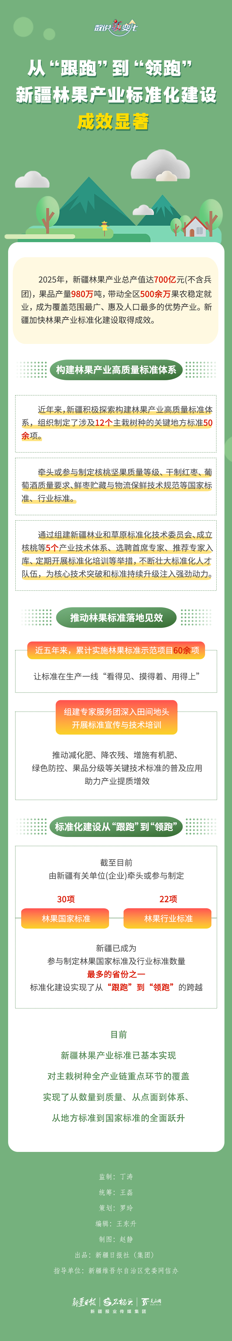 2025年,新疆林果产业总产值达700亿元(不含兵团),果品产量980万吨,带动全区500余万果农稳定就业。这一成果背后,是标准化、规模化与品牌化协同推进的集中体现。本期《数说“新”变化》为您解读新疆林果产业标准化建设的发展路径。
