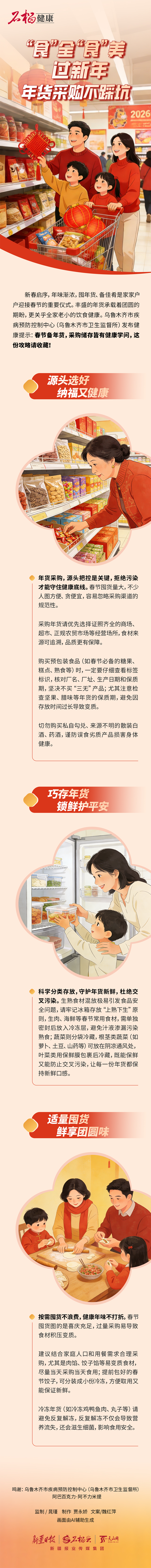 新春启序,年味渐浓,囤年货、备佳肴是家家户户迎接春节的重要仪式。丰盛的年货承载着团圆的期盼,更关乎全家老小的饮食健康。乌鲁木齐市疾病预防控制中心(乌鲁木齐市卫生监督所)发布健康提示:春节备年货,采购储存皆有健康学问,这份攻略请收藏!