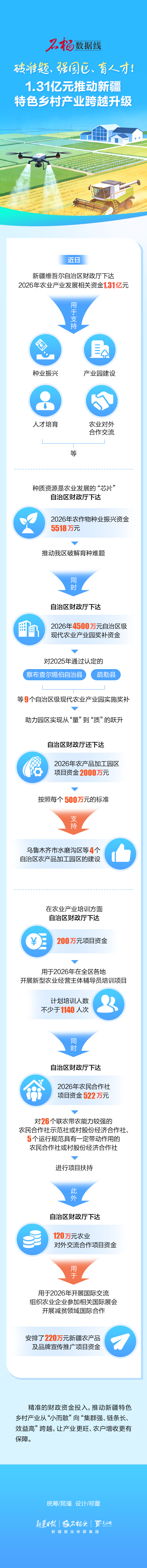 近日,自治区财政厅下达2026年农业产业发展相关资金1.31亿元,用于支持种业振兴、产业园建设、人才培育、农业对外合作交流等。精准的财政资金投入,推动新疆特色乡村产业从“小而散”向“集群强、链条长、效益高”跨越,让产业更旺、农户增收更有保障。