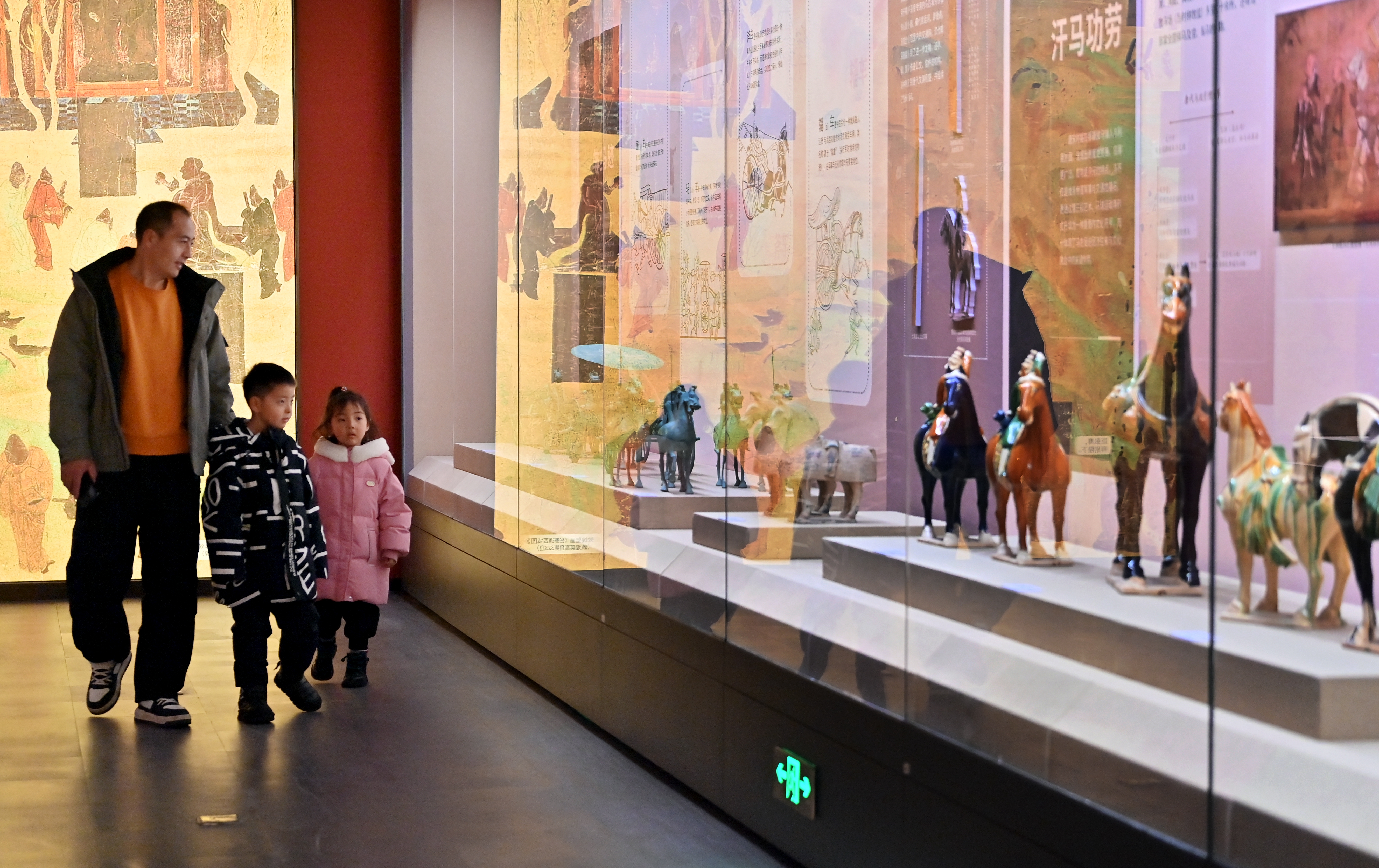 石榴云/新疆法治报讯(记者 单坤报道)2月10日,市民在乌鲁木齐市博物馆参观《飞马行疆——丙午马年文物特展》。该展览由乌鲁木齐市博物馆联合甘肃省博物馆、伊犁哈萨克自治州博物馆推出原创特展,以馆藏文物飞马流云纹砖为亮点,荟聚三地馆藏马辔头、马衔、马鞍等与马相关的精品文物180余件。据悉,今年春节期间,全区博物馆以“马年贺春”为主题,以群众喜闻乐见的互动形式为核心,精心策划推出涵盖专题展览、非遗体验、文物打卡等300余场活动,让博物馆成为年味聚集地、文化传播地。