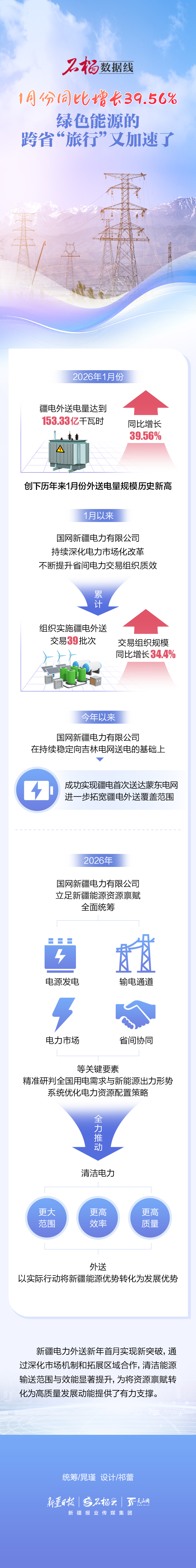 2026年1月份疆电外送电量达到153.33亿千瓦时,同比增长39.56%,创下历年来1月份外送电量规模历史新高。