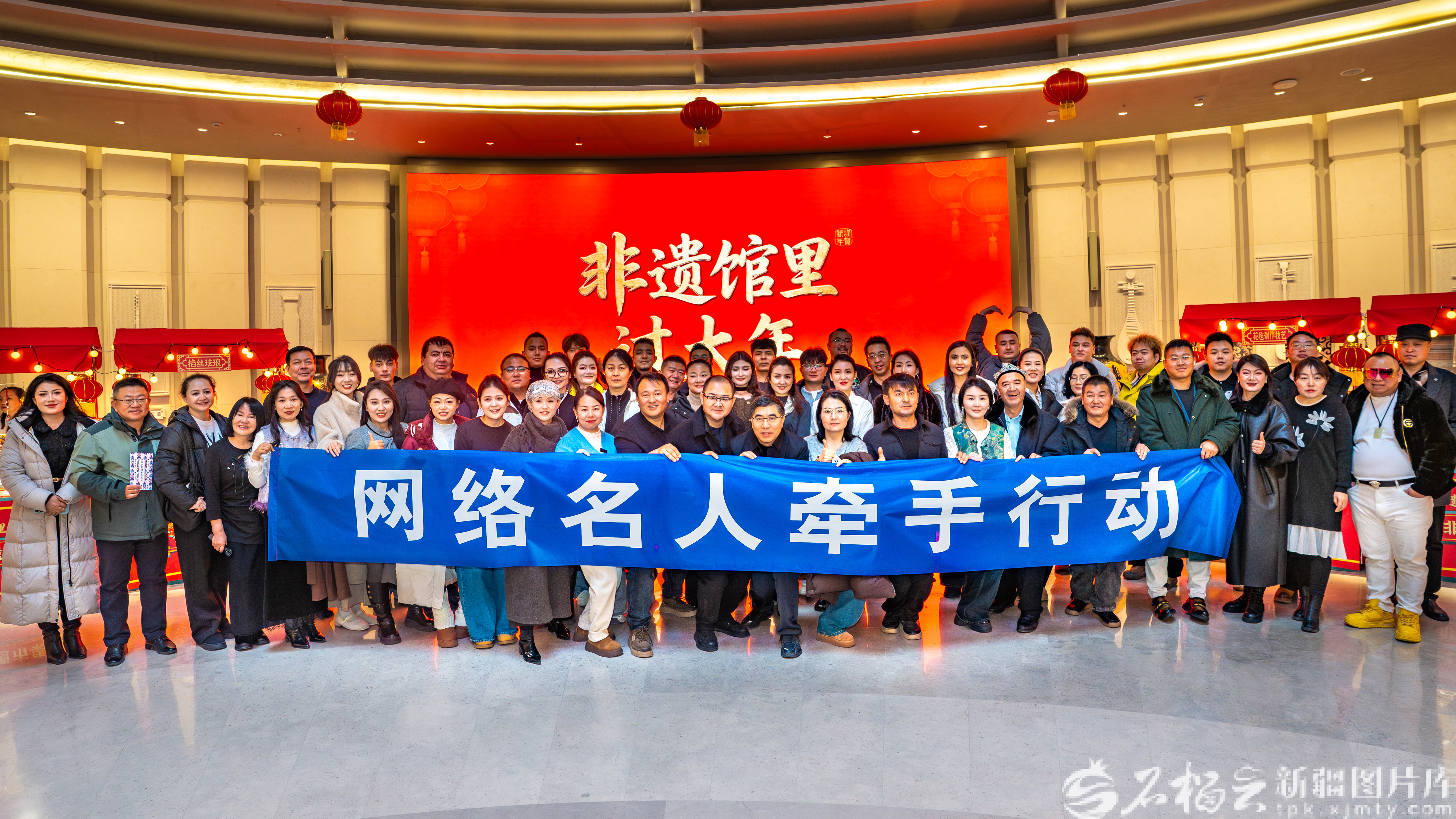 临近春节,新疆非物质文化遗产馆内年味浓郁,大屏上的“非遗馆里过大年”字样格外醒目,灯彩与年画双展联动,尽显中华民俗韵味。网络名人前后来到“节庆中的非遗”“生活中的非遗”“礼俗中的非遗”“各省区市的非遗”展厅认真参观,在非遗盛宴中感受中华优秀传统文化的博大精深。