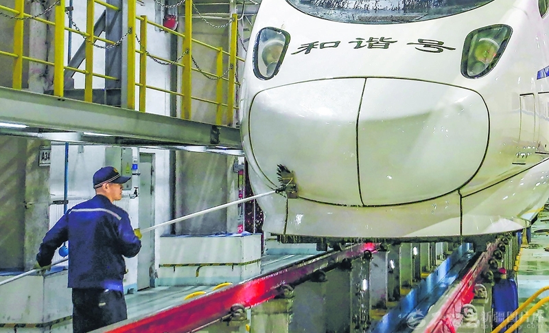 2月4日,中国铁路乌鲁木齐局集团有限公司乌鲁木齐车辆段动车片区,工作人员清洗动车外体。