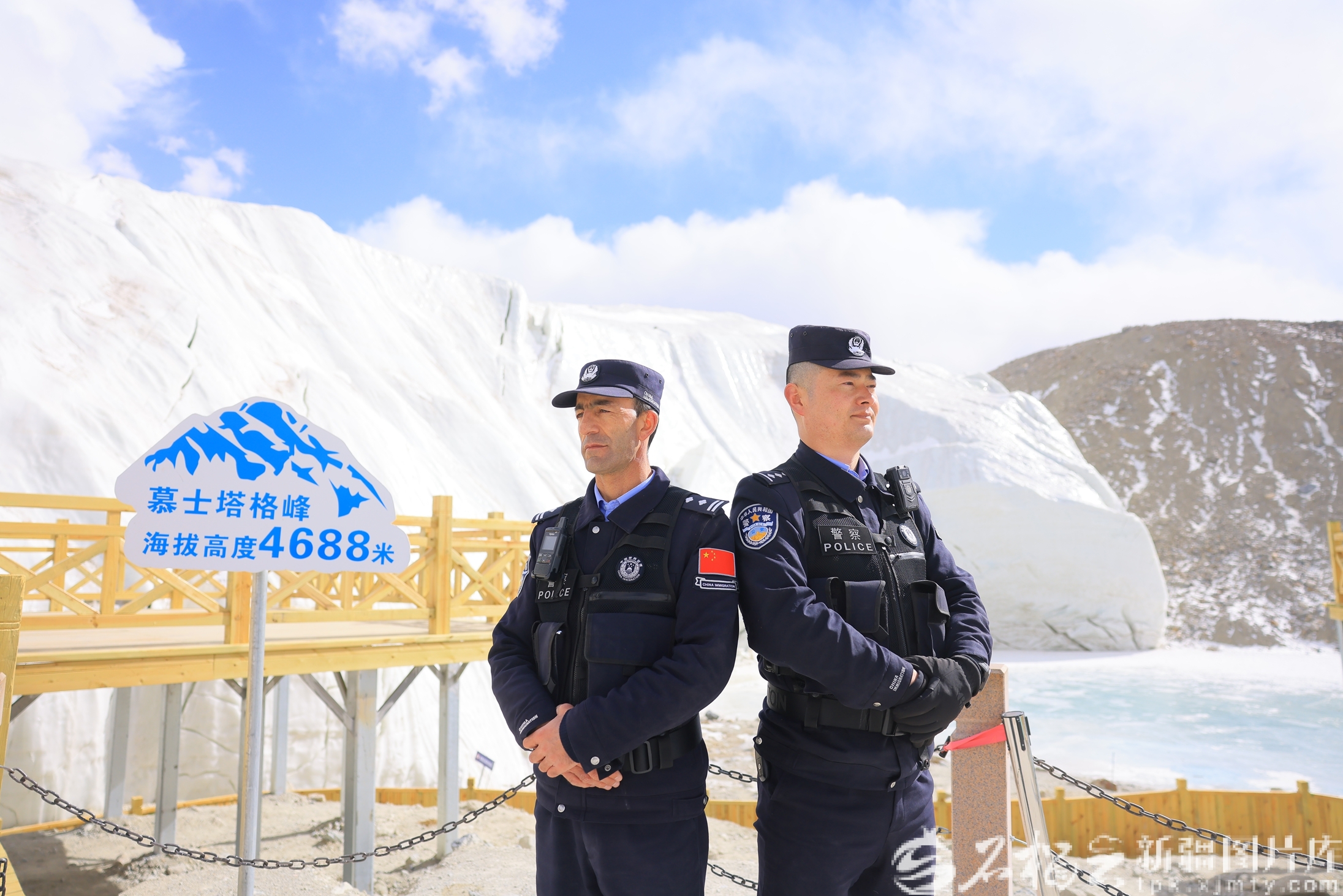 科克牙尔边境派出所民警夏吾拉木·巴都尔和冉旭浩在慕士塔格冰川公园执勤。赵家充 摄