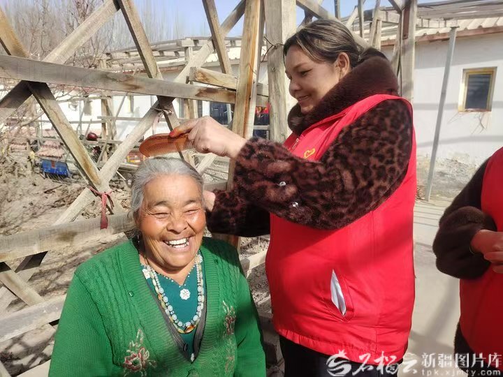 3月2日,泽普县新泽社会工作服务中心志愿者在赛力乡巴扎村开展志愿服务,为老年人理发。泽普县新泽社会工作服务中心供图
