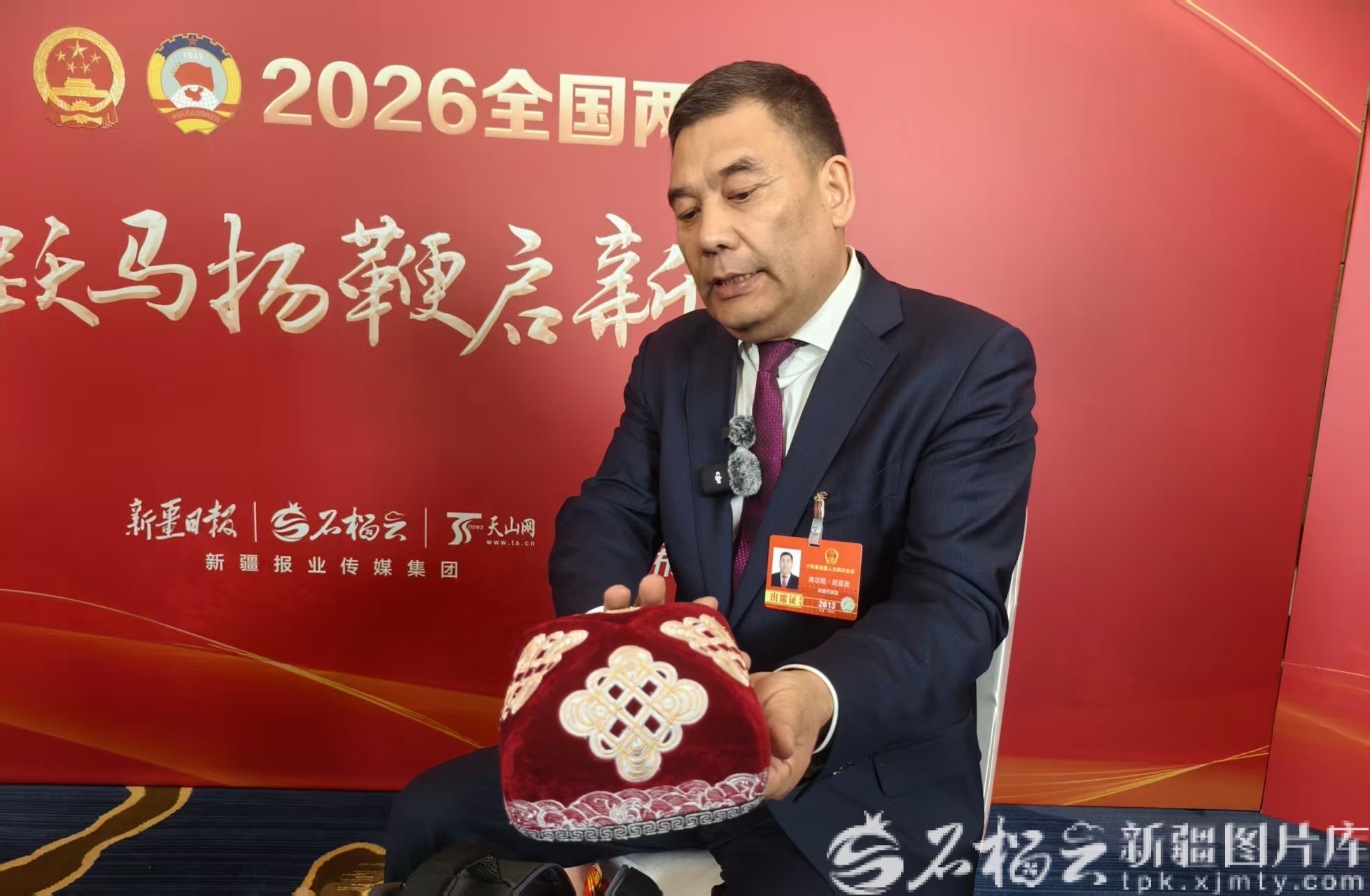 全国人大代表库尔班·尼亚孜向记者展示他带来的小花帽。记者 黑宏伟摄
