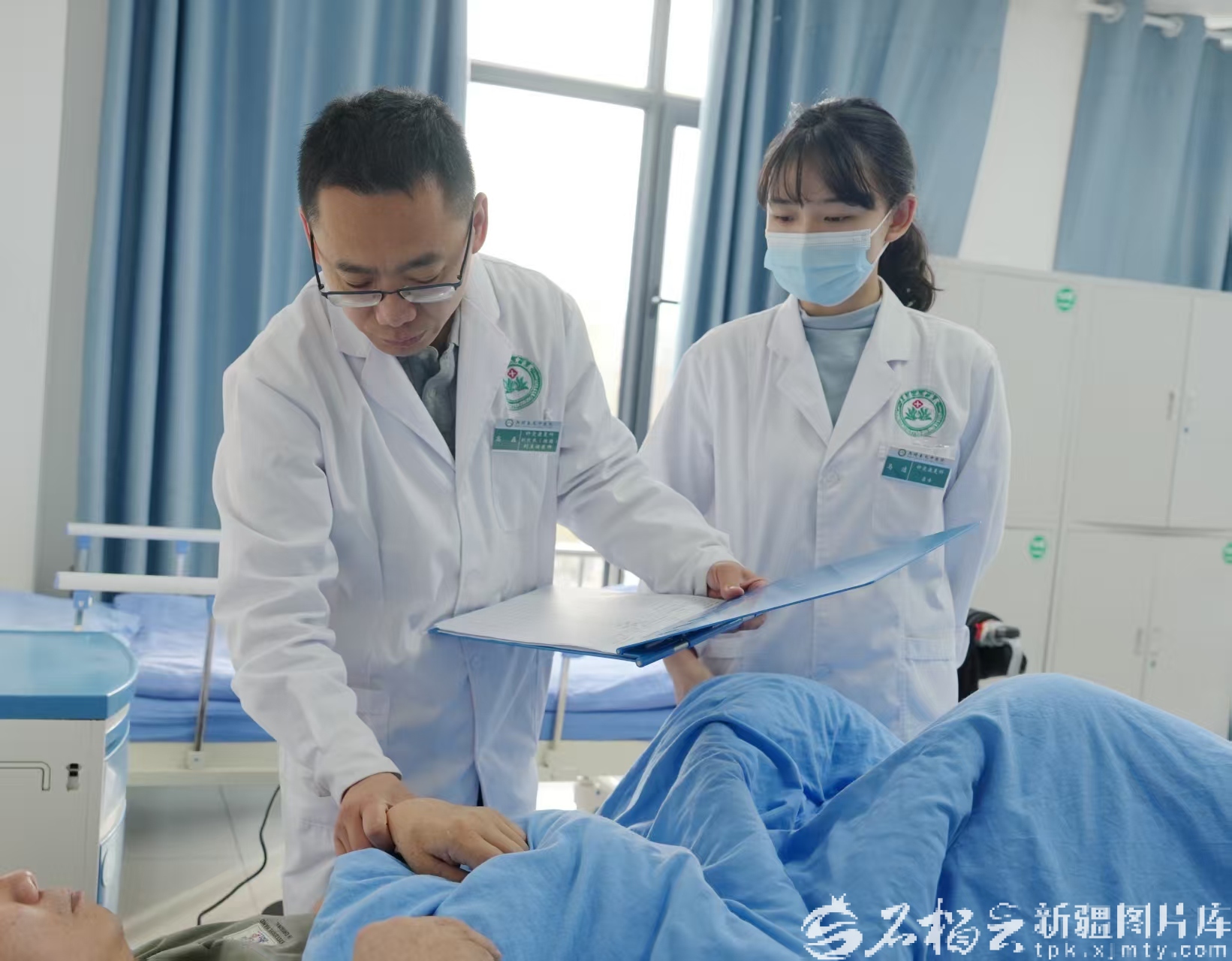 3月24日,高磊(左)在查房。新疆生产建设兵团奎屯中医院供图