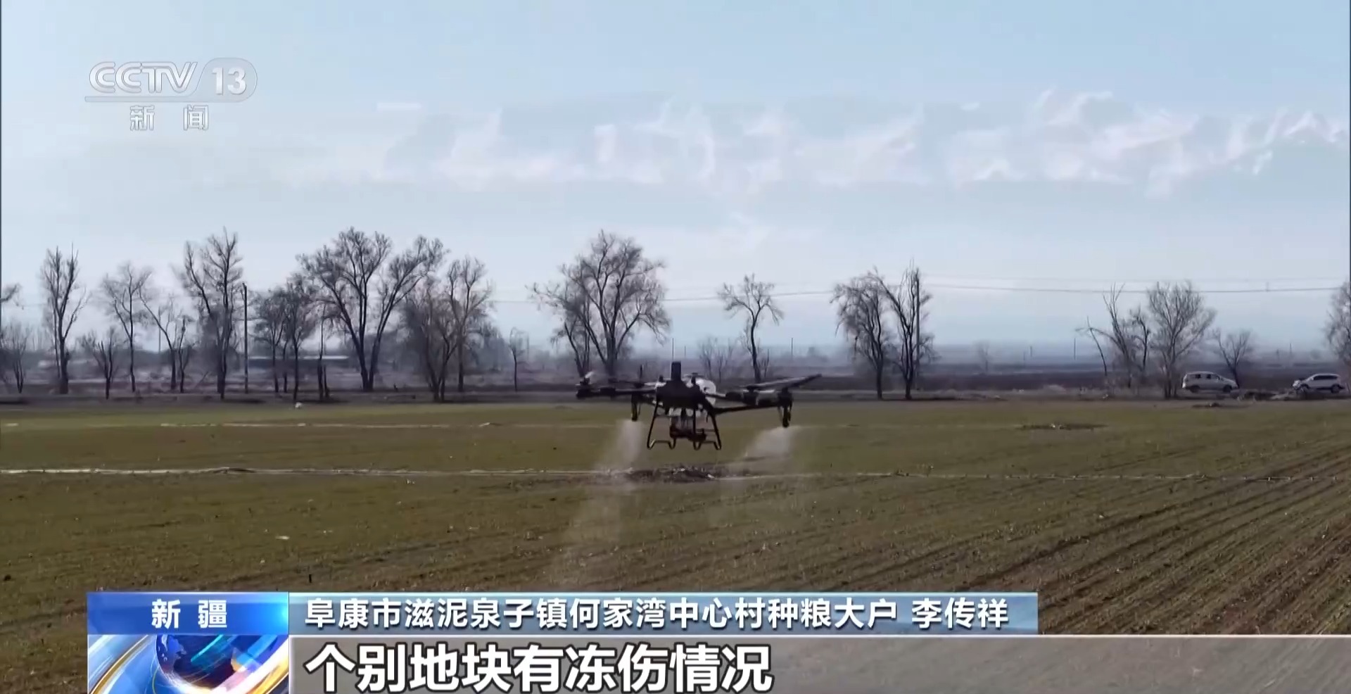 阜康市滋泥泉子镇何家湾中心村种粮大户 李传祥:镇上的技术员和我一起来田间地头看了一下,个别地块有冻伤情况,需要无人机飞防叶面肥。现在的无人机打药特别方便,一上午就飞完了,希望今年有个好收成。